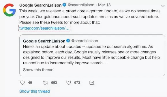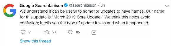 谷歌在也在几天前发布了最新核心搜索算法更新的通知,官方命名为“March 2019 Core Update”。并表示这是多年来非常大的一次更新,将会对整体算法进行改进。