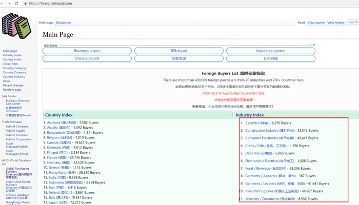 这是个很神奇的网站,打开后你会觉得:这是个什么玩意儿的布局啊?虽然网站布局看起来是不那么的美观,但是内容超实用,里面有不少广交会的名录、采购商,并且还细分行业。更多的惊喜数据功能还需要看官们自己去挖掘。