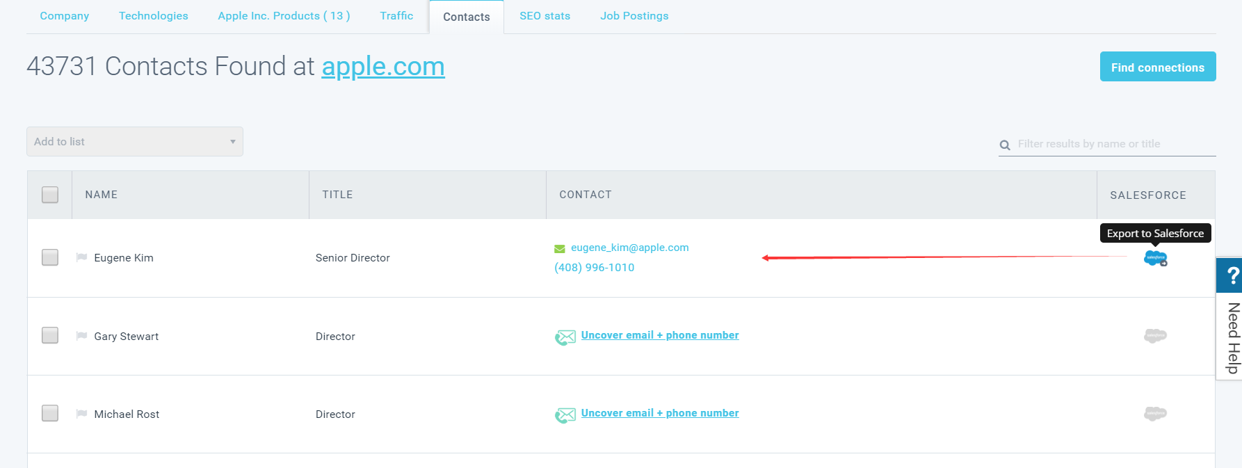 别急,还有更强大的功能——Contacts联系人,选中Contacts联系人功能,则会出现该公司所有联系人的信息,包含姓名、职位、电子邮箱以及电话,邮箱和电话只需要单击右侧的Salesforce即可为你一一找到。