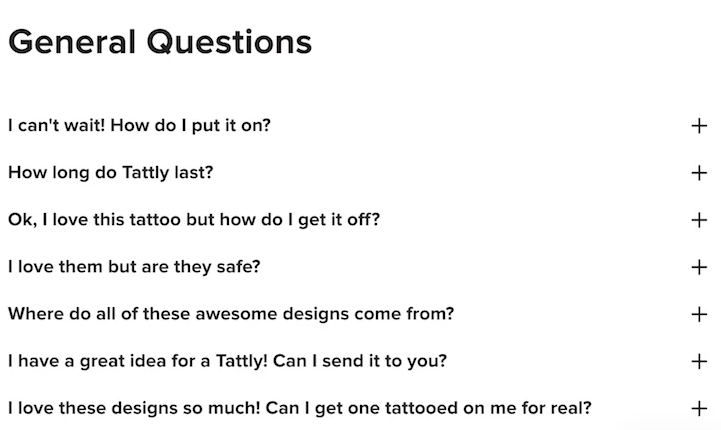 这种设计增加了一种简洁的感觉。当访客进入到页面时,他们会看到每个文本框项目的问题。只有当他们点击框中的问题时,它才会展开,答案才会出现。