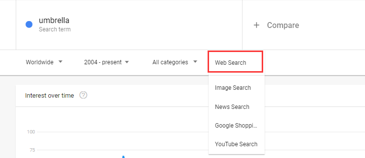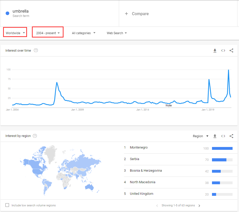 使用Worldwide(全球)可以帮助您在地理上定位一个特定的市场。例如,你会看到“umbrella”这个词在不同的半球出现高峰的时间不同。