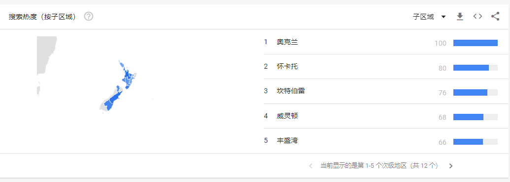 同时可以看到按照区域显示的搜索热度,43个国家和地区中新西兰、孟加拉国、澳大利亚、美国和加拿大等国家是搜索热度最高的国家,这也是产品进行营销推广需要重点考量的市场。
