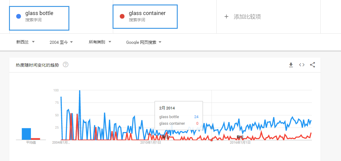 卖家都知道有的时候同一款产品,有很多种叫法,在这里卖家也可以对比分析出来,哪一个词人们最喜爱搜索, 比如”glass bottle” 和“glass container”, 卖家可以看到相对于glass container, 人们更偏好使用glass bottle。