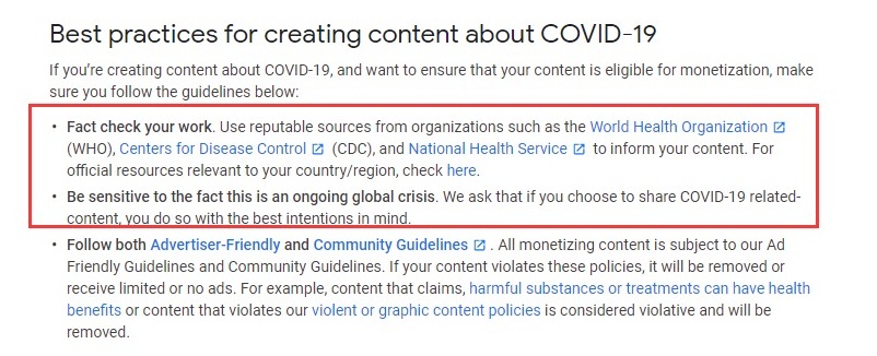 比如你可以很好地利用YouTube这一视频平台,虽然目前关于COVID-19的视频广告内容是被禁止的,但YouTube提供了以下建议,如果视频创作者需要用到和COVID-19相关的内容,必须要核实你的内容使用来自世界卫生组织(WHO)、疾病控制中心(CDC)和国民健康服务(NHS)等组织的可靠信息来源。