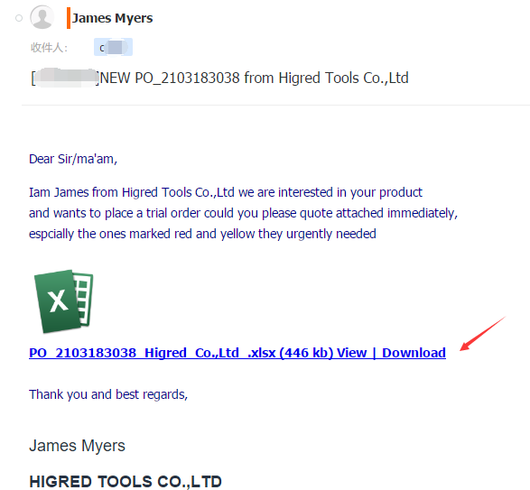相信不少外贸ers看到这么诱人的PO邮件,会急不可耐地去点击【Download】进行下载。而点开后并不是如文件名所示的PO,而是让你输入邮箱密码的链接,你还会继续吗?