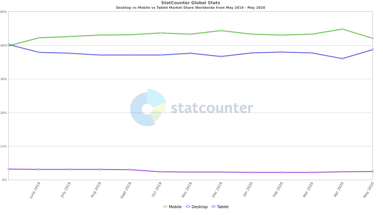 根据以下最新的2020年统计数据,全球所有搜索者中有50.34%使用手机,而46.67%的搜索者使用台式机。其余的2.99%的人使用平板电脑。