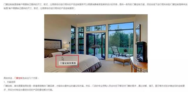如上图,当把鼠标移到图片上,就会显示出“门窗定制效果图”,这就是这张图片的ALT标签内容了。现在很多人为了方便,基本都不去设置ALT标签,这很不利于搜索引擎抓取。