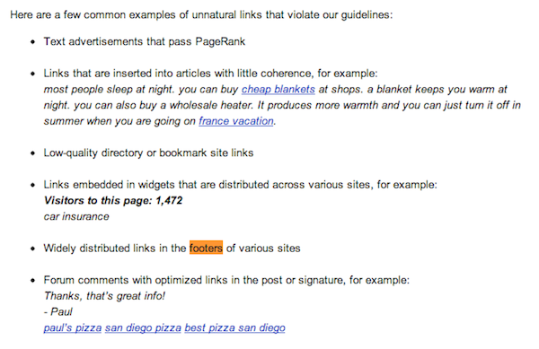 上面的算法说得白话一点,就是在非本站以页尾整站的方式(sitewide footer) 大量建立链接到自己的网站,Google已经于2012年底开始列为禁止的项目。