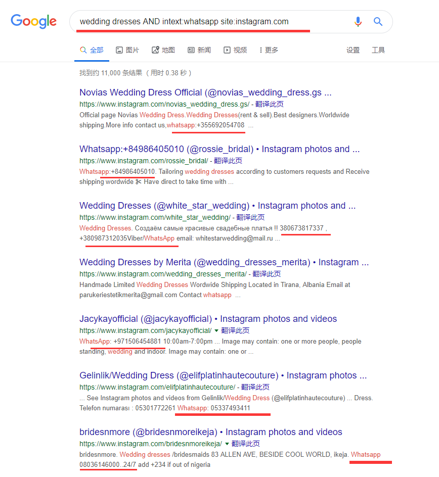 在谷歌中搜索【wedding dresses AND intext:whatsapp site:instagram.com】