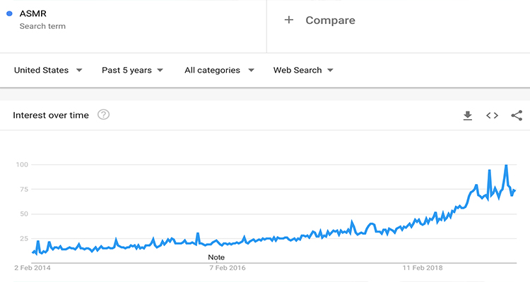 目前,ASMR视频在美国的月搜索量为820万次,在全球的月搜索量为2570万次。谷歌趋势数据显示,人们对ASMR的兴趣只是在两年前才真正开始增长,然而目前ASMR视频的搜索热度在美国排名第一,在全球排名第五,在YouTube上也迅速蹿红。