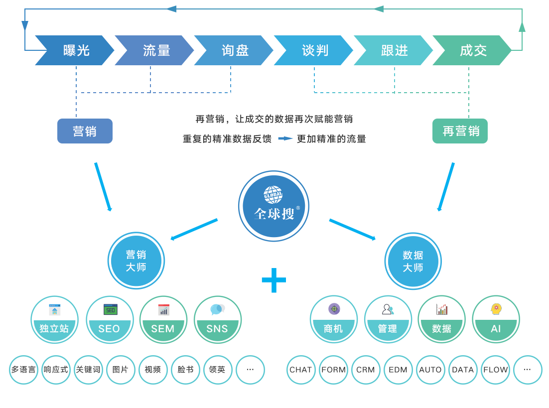 全球搜以SaaS平台架构为基础,以“营销+再营销”系统为核心,结合大数据技术、人工智能、搜索算法、数字营销和社交营销为一体,