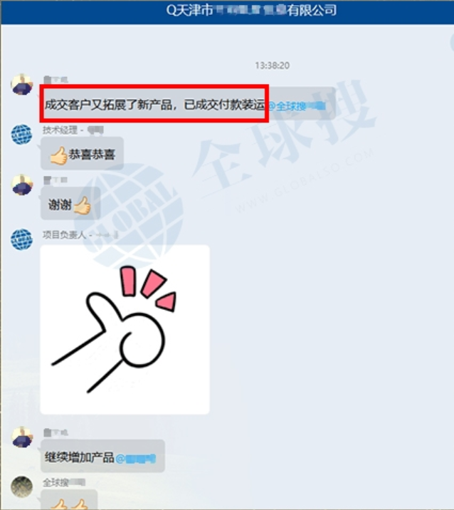每一次听到客户说自己成单了,我们都非常的激动与欣喜,这是对于全球搜最大的支持与鼓励,这种来自市场的直接认可将是我们最大的动力。