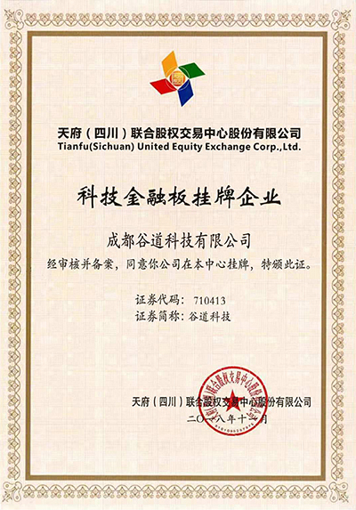 2018年11月,成都谷道科技有限公司在新四板正式挂牌,证券简称“谷道科技”,证券代码:710413。这标志着谷道科技进入了加速发展的新航道,更是谷道科技发展新历程的标志。